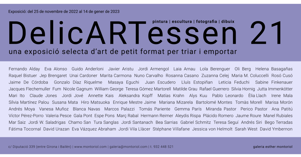 DelicARTessen 21. Galería Esther Montoriol, Barcelona Compártelo: Haz clic para compartir en X (Se abre en una ventana nueva) X Haz clic para compartir en Facebook (Se abre en una ventana nueva) Facebook Me gusta Cargando...