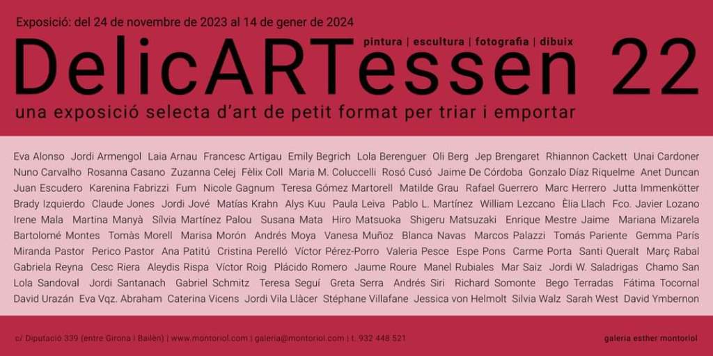 DelicARTessen 22. Galería Esther Montoriol, Barcelona Compártelo: Haz clic para compartir en X (Se abre en una ventana nueva) X Haz clic para compartir en Facebook (Se abre en una ventana nueva) Facebook Me gusta Cargando...