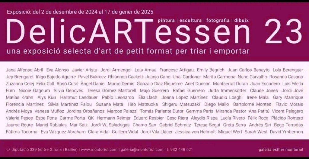 DelicARTessen 23. Galería Esther Montoriol, Barcelona Compártelo: Haz clic para compartir en X (Se abre en una ventana nueva) X Haz clic para compartir en Facebook (Se abre en una ventana nueva) Facebook Me gusta Cargando...