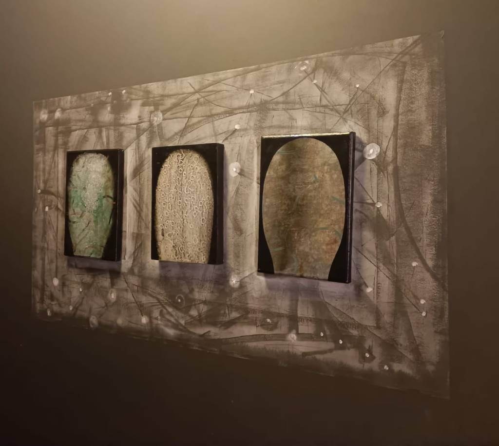encontrado que Plácido Romero ha transformado en tabla de exploración artística. Sobre este soporte, el artista ha compuesto con acetatos – también encontrados y manipulados – un tríptico que crea un esquema visual buscando fórmulas para enfrentarse a lo desconocido. Es una pieza experimental que aspira a desvelar el misterio.